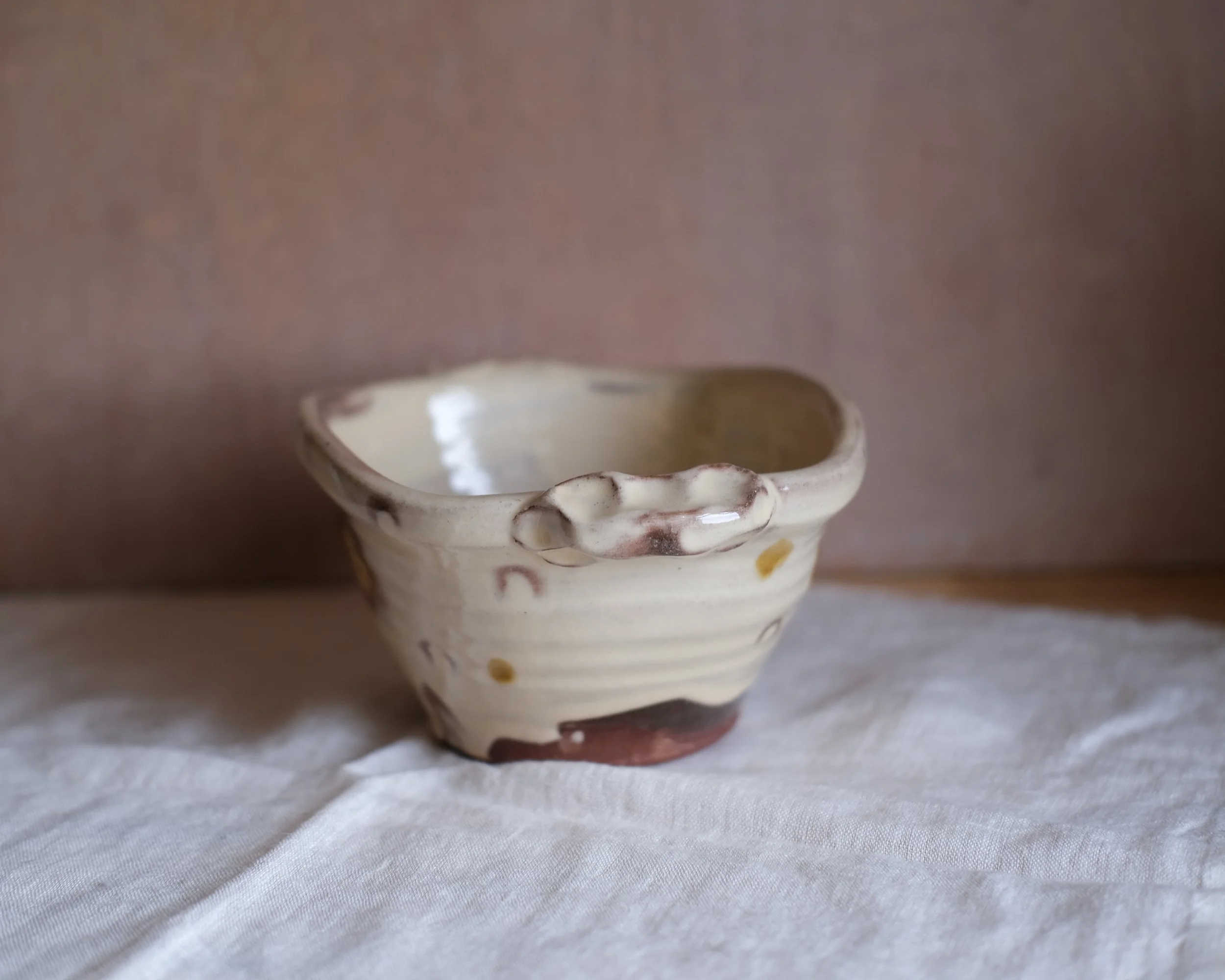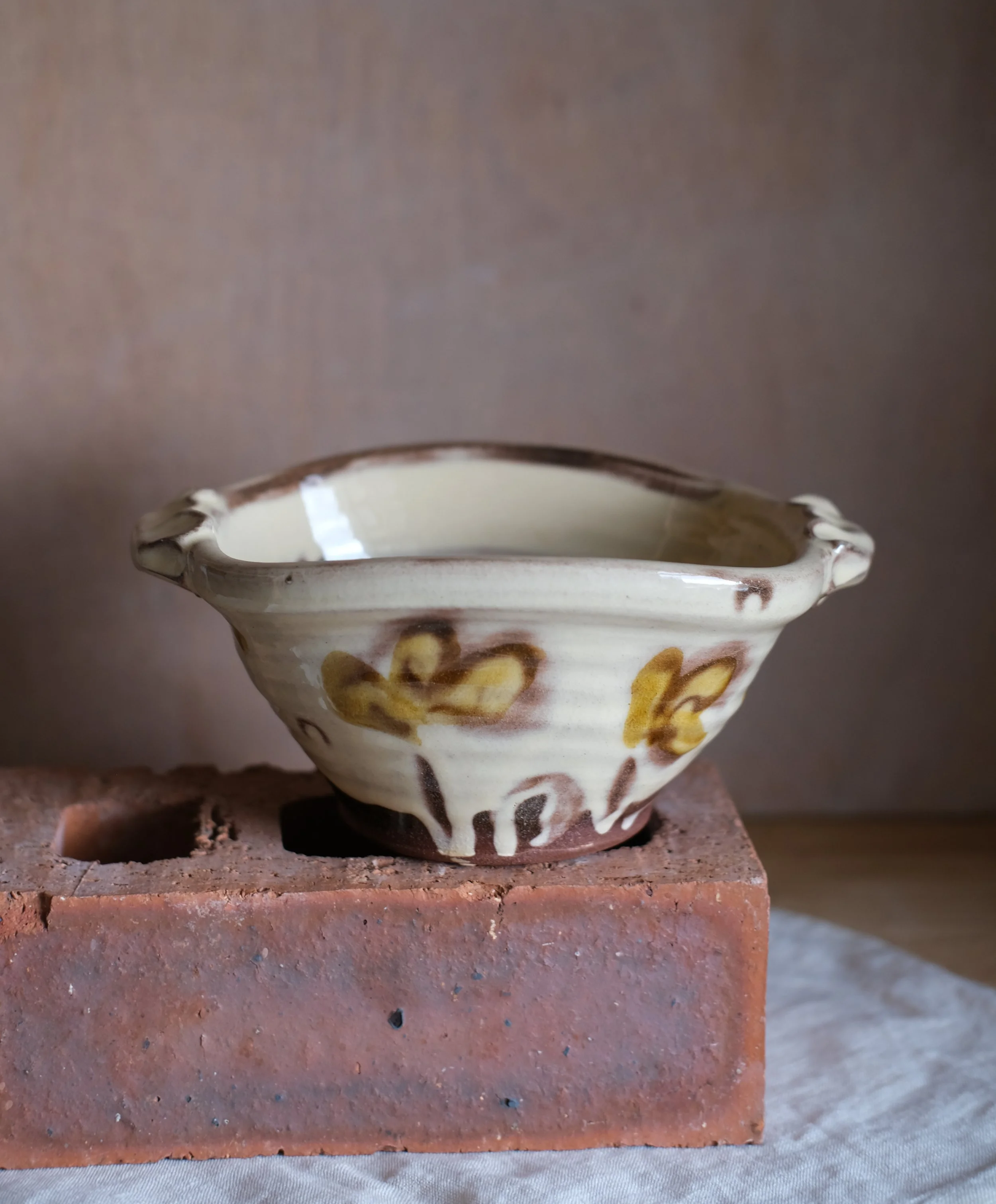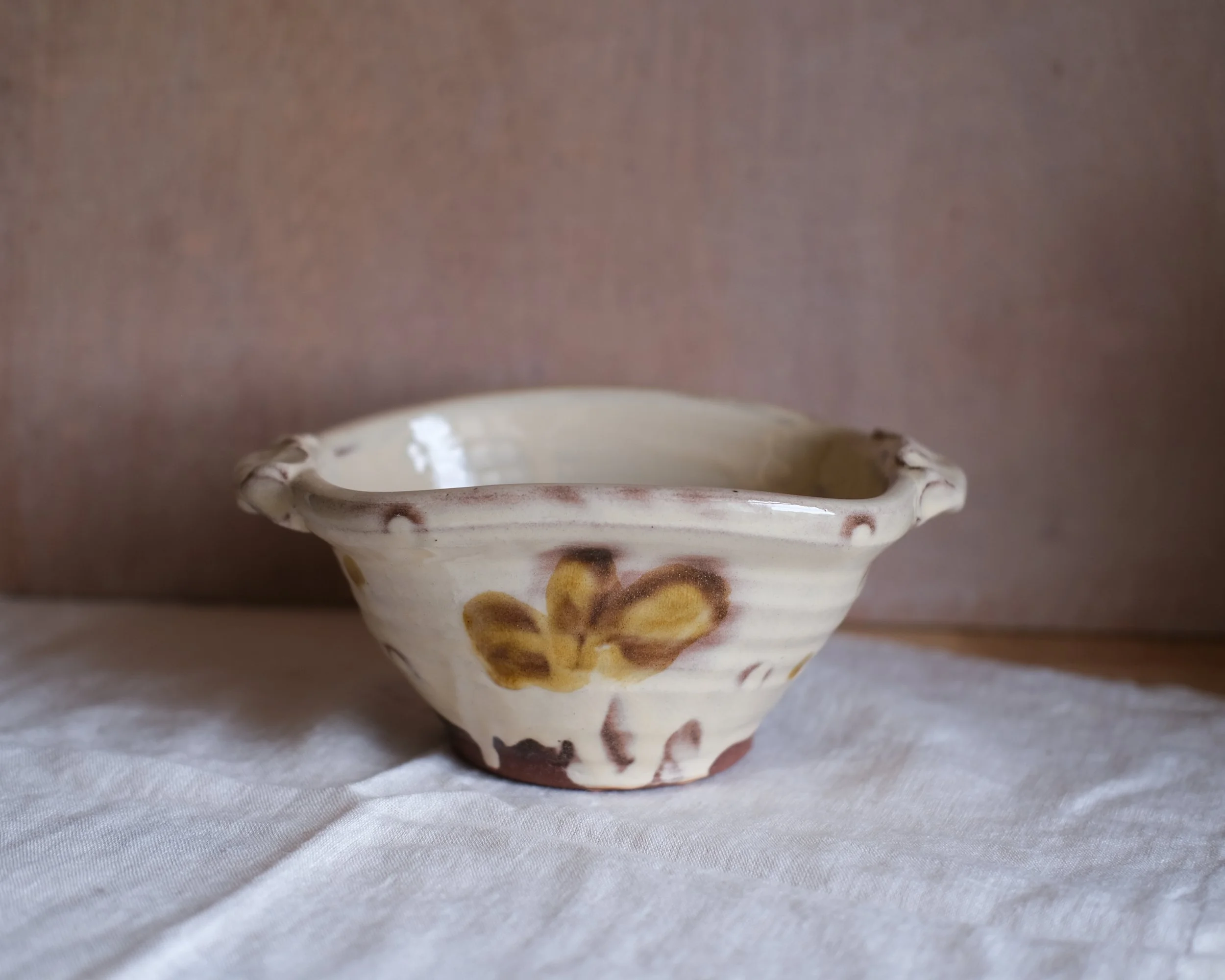 Medium Sized bowl thrown using a coarse terracotta clay from Stoke on Trent, decorated with white slip and glazed in a creamy transparent glaze.