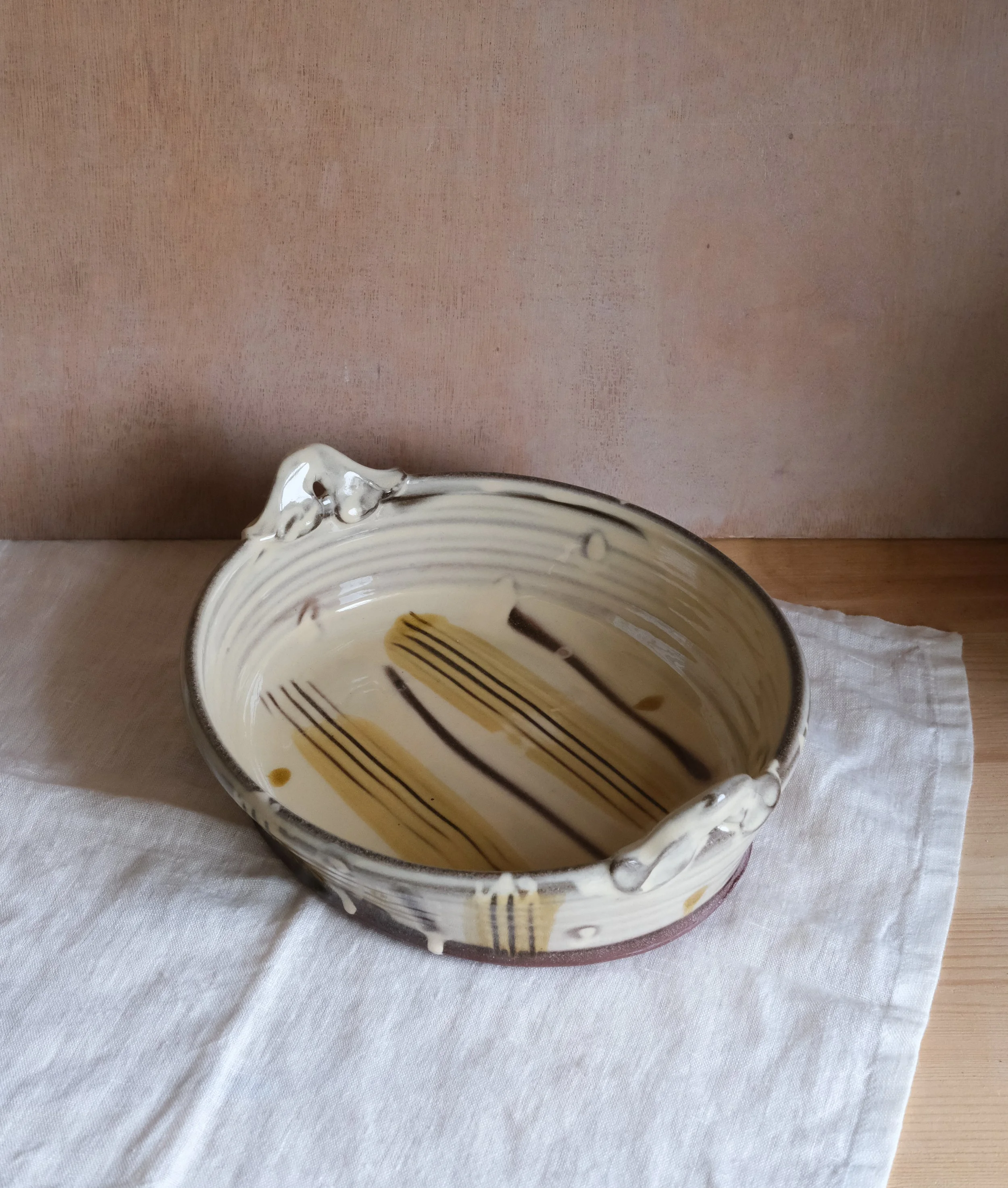 Thrown and altered oval dish, thrown using terracotta clay from Stoke-on-Trent, decorated with white slip and glazed in a transparent glaze.