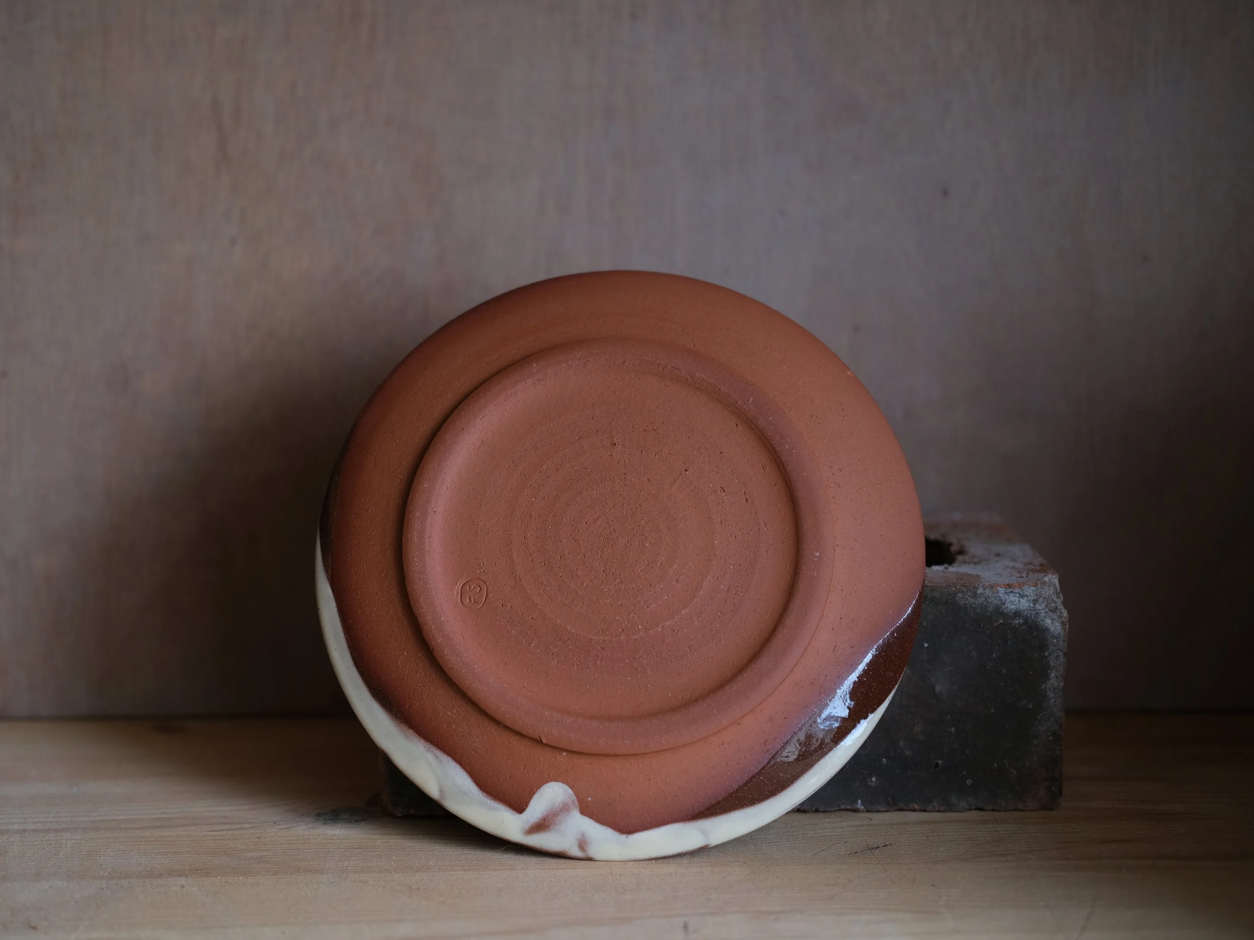 Thrown and altered, softly squared basket bowl with little lug handles on each side. Thrown using terracotta clay from Stoke-on-Trent, decorated with white slip and glazed in a mixture of transparent and honey glazes.